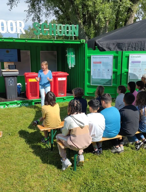 Onze containers, helemaal op maat gemaakt in Rotterdamse kleuren, worden tijdens deze tour gebruikt als mobiele leslokalen en expositieruimtes. Een circulair concept dat helemaal past bij onze visie op hergebruik en duurzaamheid.