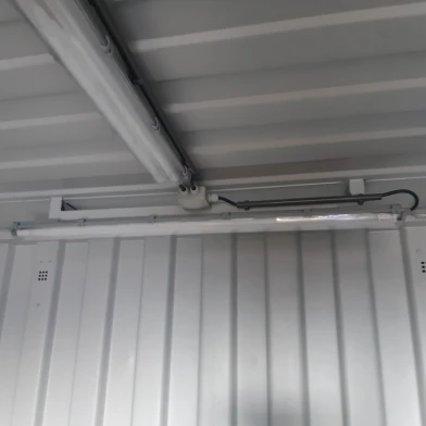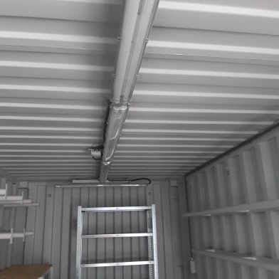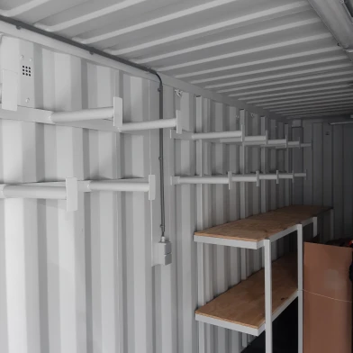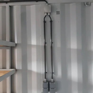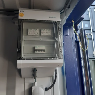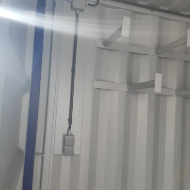 Goede stroomvoorziening is essentieel in elke werkruimte. Daarom is deze container voorzien van een elektrische installatie op maat, volledig aangepast aan de werkzaamheden van de klant. Denk aan verlichting, wandcontactdozen, kabelgoten en eventueel krachtstroom: alles is mogelijk
